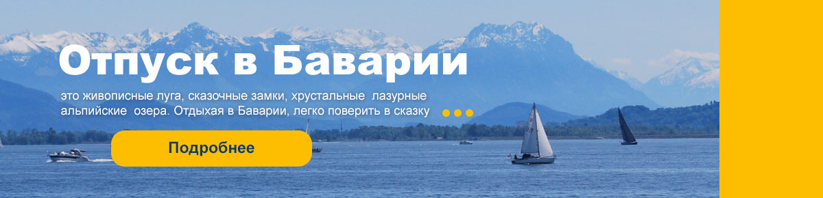 Для групп и индивидуальных туристов мы предлагаем отдых в Германии: поездки по Баварии с посещением сказочных замков Баварии, Мюнхена, живописных альпийских лугов и озер, экскурсии по городам Германии. Отдыхая в Германии, легко поверить в сказку.